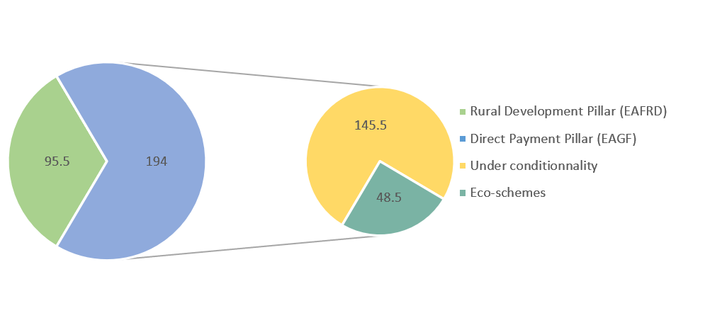 - The first pillar – the European Agriculture Guarantee Fund – focuses on direct payments based on farm size rather than production levels. This approach is intended to prevent overproduction but induce a bias: historically, 80% of the smallest farms got only 30% of direct payments. To correct this, this new version plans 10% of direct payments to be allocated as a redistributive income support tool, aiming to increase payments to smaller farms. Additionally, the new CAP introduces voluntary “eco-schemes,” with 25% of the first pillar budget dedicated to these schemes. Ecoschemes provide funding and incentives for climate and environmentally friendly practices, and each member state tailors them. In addition, farmers receiving CAP support must also meet stricter conditionalities, including reinforced requirements for good agricultural and environmental practices such as crop rotation and diversification.